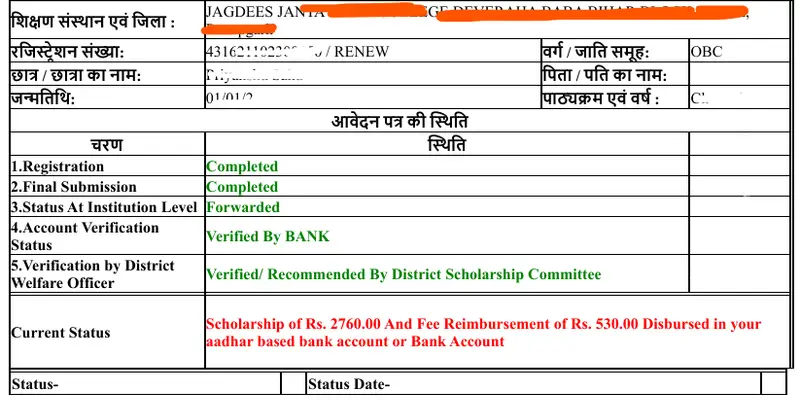 - फिर स्क्रीन पर छात्रवृत्ति फार्म की स्टेटस दिखाई देने लगेगी।