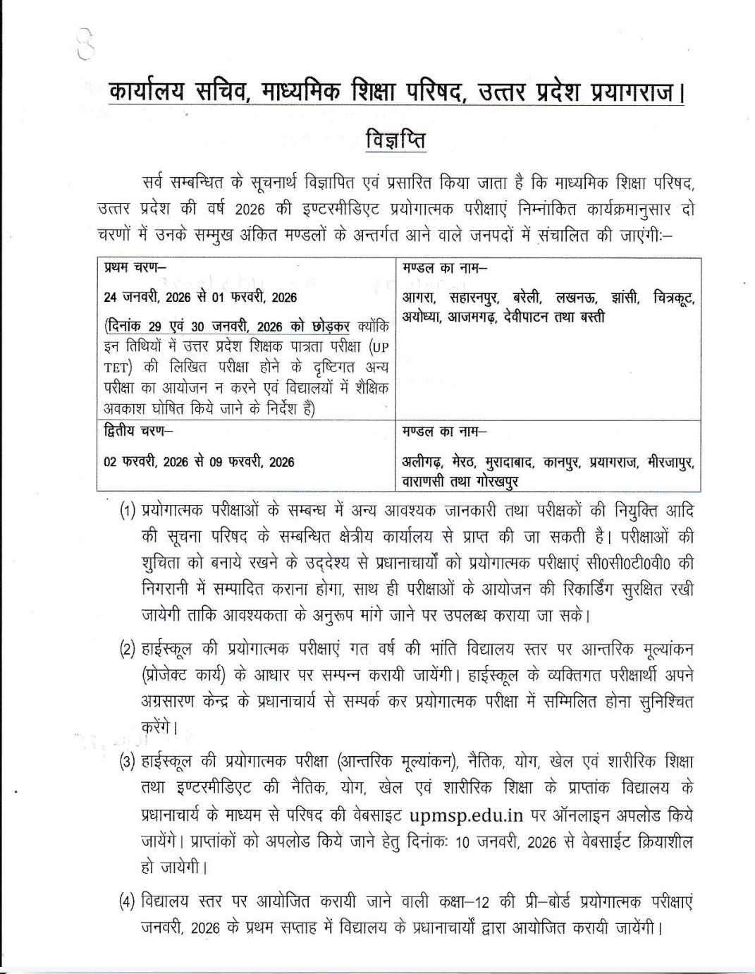 यूपी बोर्ड इंटर कक्षाओं के प्रैक्टिकल एग्जाम की तिथि माध्यमिक शिक्षा परिषद उत्तर प्रदेश प्रयागराज द्वारा 16 दिसंबर को जारी कर दी गई है दो चरण में सभी मंडल की प्रैक्टिकल परीक्षाएं आयोजित की जाएगी पहले चरण की प्रैक्टिकल परीक्षा 24 जनवरी से 1 जनवरी 2026 तक आयोजित होगी जिसमें आगरा सहारनपुर बरेली लखनऊ झांसी चित्रकूट अयोध्या आजमगढ़ देवीपाटन तथा बस्ती शामिल होंगे और दूसरे चरण की परीक्षाएं 2 फरवरी से 9 फरवरी 2026 तक आयोजित होगी जिसमें अलीगढ़ मेरठ मुरादाबाद कानपुर प्रयागराज मिर्जापुर गोरखपुर एवं वाराणसी मंडल शामिल है।